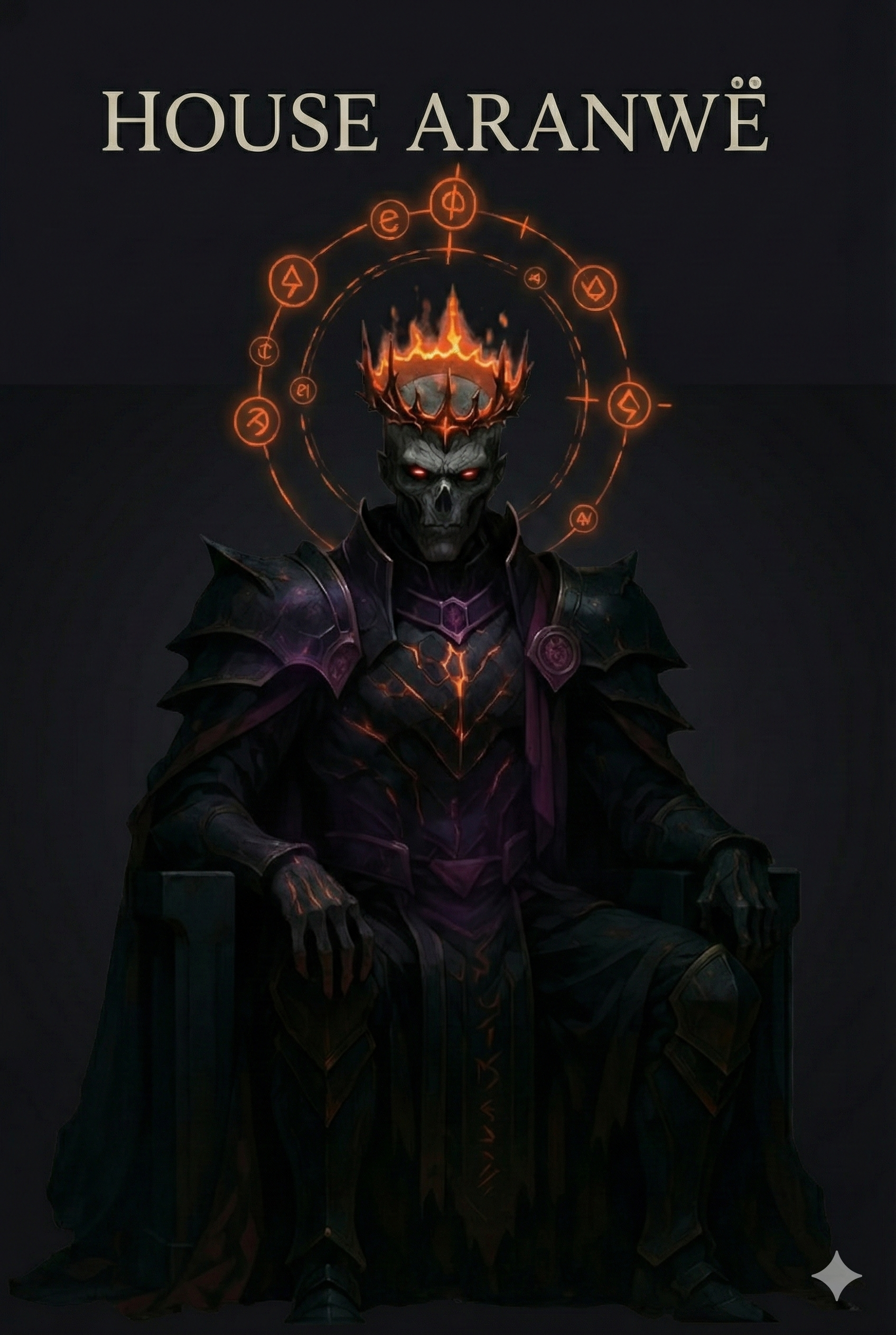 In the moment between death and oblivion, The Darkness whispered to Prince Velrith Aranwè. Betrayed by those he trusted, executed before the masses, he should have faded into nothing. Instead, he rose—phylactery bound, sovereign reborn, avatar of an ancient primordial hunger. House Aranwè is his dominion. Each relic, a fragment of his power. Each vassal, a witness to his eternal Court.